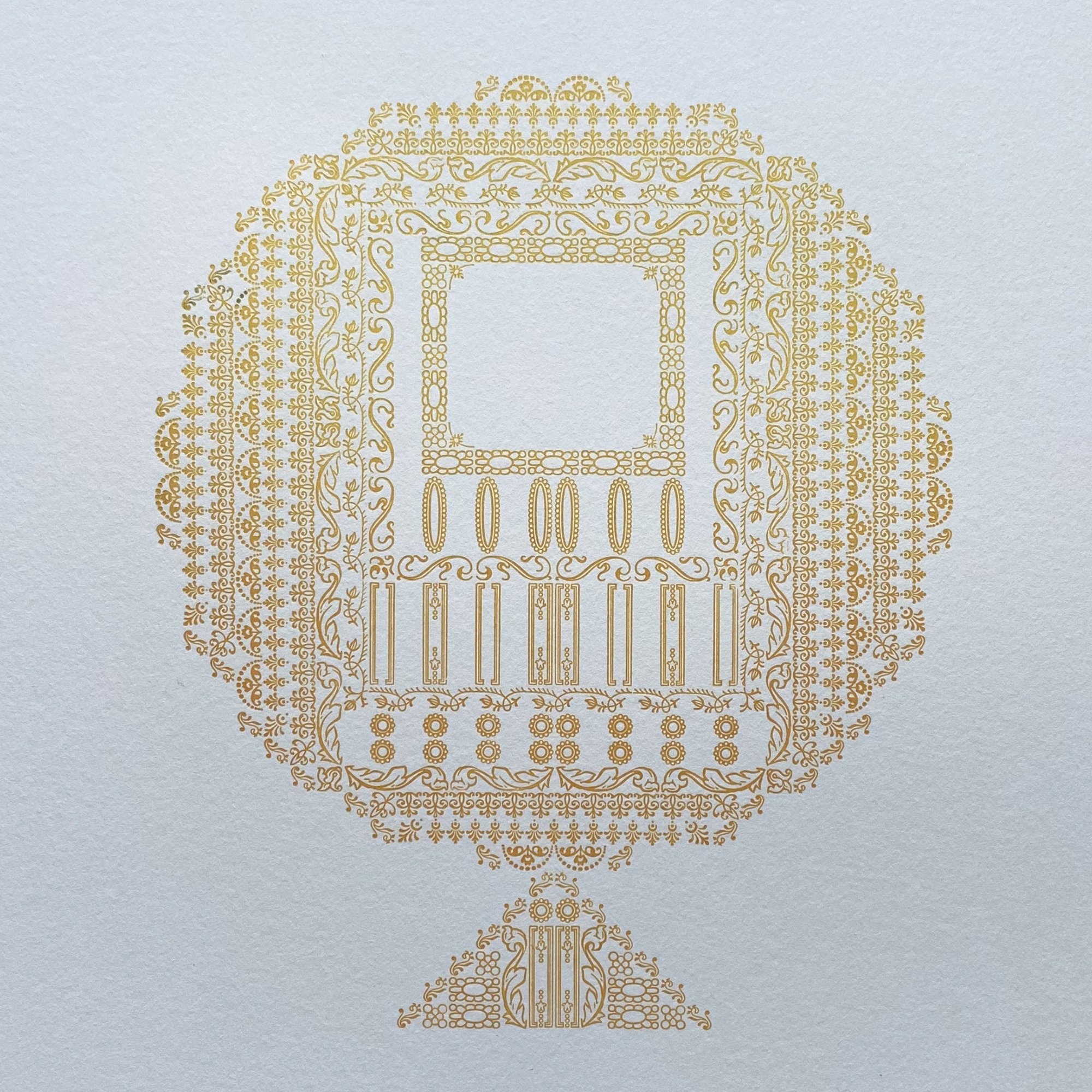 I proofed an entire letter with the first split color to make sure all alignment and set up was correct before pulling out the ornaments that would be used for the second color pass. You can see there’s a very gentle color shift from top to bottom.
