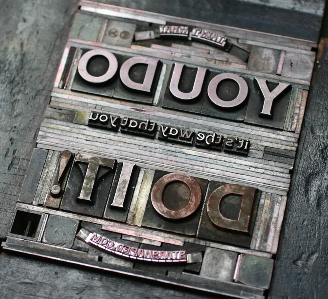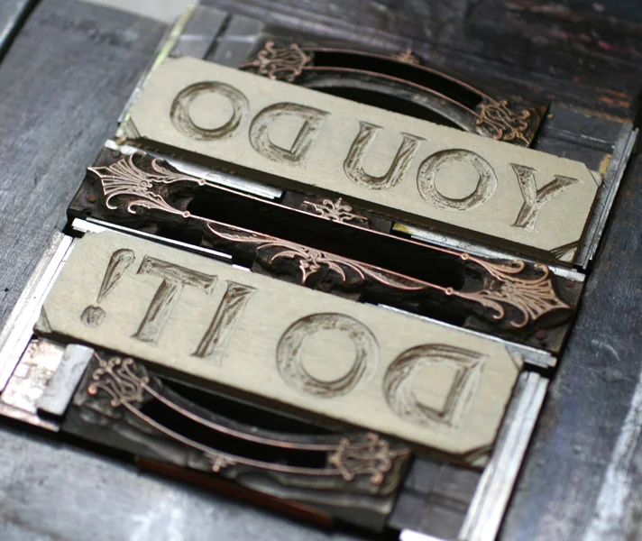 Early in 2012, I decided to put together a comprehensive collection of pieces that would showcase the absolute best typesetting and printing that Starshaped was capable of, largely inspired by the gorgeous print samples featured in The Handy Book of Artistic Printing. The studio has many of the bits and pieces used to create fanciful designs without the aid of lithography (or the modern equivalent of digital typesetting), and I wanted to show that this type of work was still alive and thriving. Because our design work for various projects breaks down into 4 aesthetic collections revolving around stylistic periods in typography, it was easy to establish there would be 4 pieces and a folder to hold them all. Because the one image that really spoke to me in Artistic Printing was an image that showed how the printers broke down the piece to be set and printed, I knew immediately that I wanted to have beautiful images of the forms (the lockup of type for printing) offset printed on the back side of each piece so that viewers could see exactly what went into creating it.