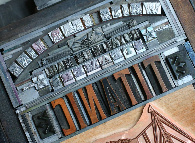 The first piece was to focus on our nineteenth century type collection and needed to be something that would run a lot of type together in the style of an advertising broadside. I happened to purchase the audiobook of Shadow of the Titanic and often found myself staring into space as the survivor's stories were so engaging and well written. An ad for the Titanic was the obvious choice, and fit the period of typography I wanted to explore, and would also give me an opportunity to draft an image of the ship. After devouring numerous books on the subject I felt that while the print would be traditional in appearance, the writing would encompass details that became relevant only with 100 years of hindsight. The 1912 'deadline' helped me research which typefaces could be used and which could be eliminated. Here is the final form in black and white for the offset run (a single spot color), along with a snippet of the top: