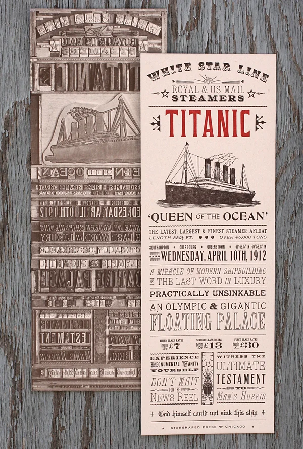 We make every effort in the studio to work exclusively with American companies, especially midwestern paper manufacturers. All of the paper for the four pieces here came from French Paper in Niles Michigan, one of our favorites. The offset printing was all done by the talented Gary and his staff at Accucolor Plus here in the city. And of course the overwelming majority of our type collection was manufactured by American type foundries. The copper Titanic plate and the two linoleum blocks were the only new materials used besides the paper, which is all at least 30% post consumer recycled stock. Printing with existing materials is definitely the most eco-friendly approach to letterpress.