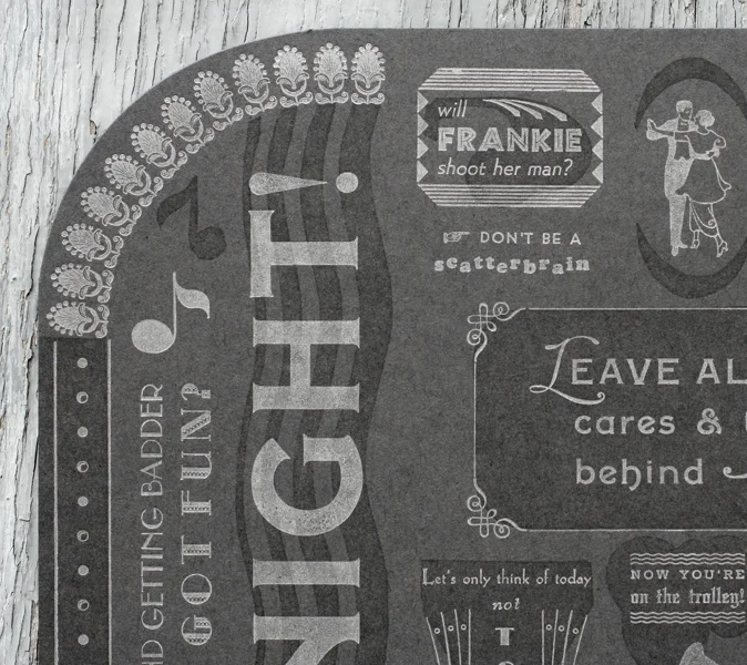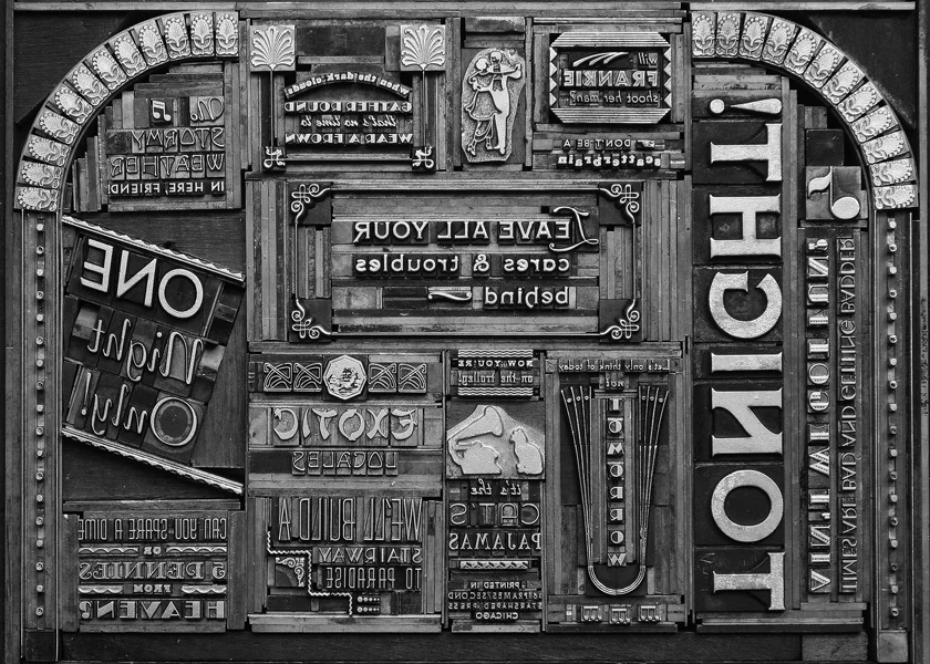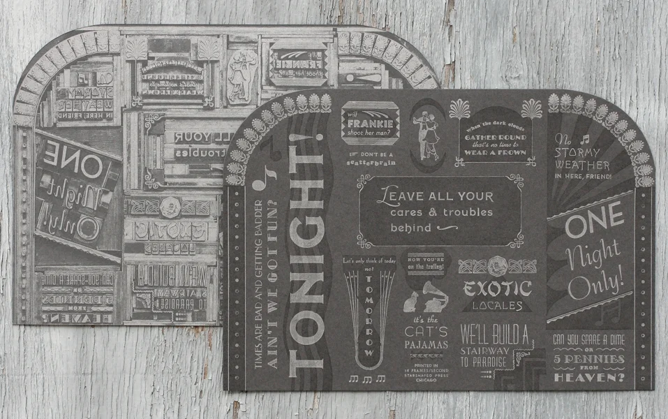 The type for Leave All Your... and TONIGHT is set in Pastel, a Chicago-designed typeface that was very popular in silent films. We have 4 fonts of it and are always on the lookout for more. It forms the basis for our silent film-inspired greeting cards.