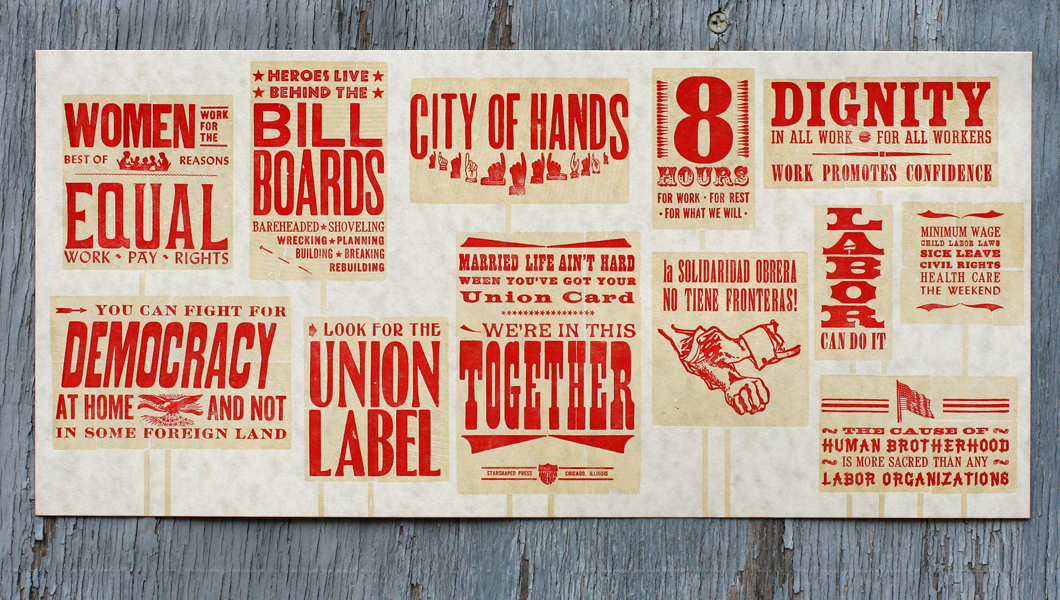 The fourth print would be a nod to Labor, Labor history and its place in Chicago. For this piece I wanted a looser feel that would incorporate as much of our wood type as possible, pulling from our smaller faces and mixing them with the styles of typography that have graced labor prints and posters for the last 100+ years. The overall aesthetic would be more rustic and would give the appearance of a sea of posters at a rally, where no one image takes center stage in the ultimate show of democracy.