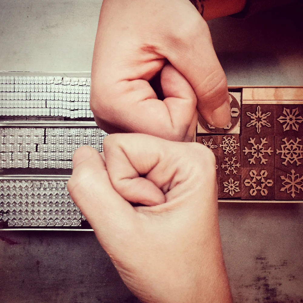 Immediately drawn to these as having been created with metal type and rule, I thought, I could do this... but can I make them... cool? Relevant? Reflective of my experiences as a woman vs. an idealized image created by men? Can I do it with just the modular type in the studio to keep the strong contrast and bold imagery? Does everyone ask themselves a million questions before starting a project?