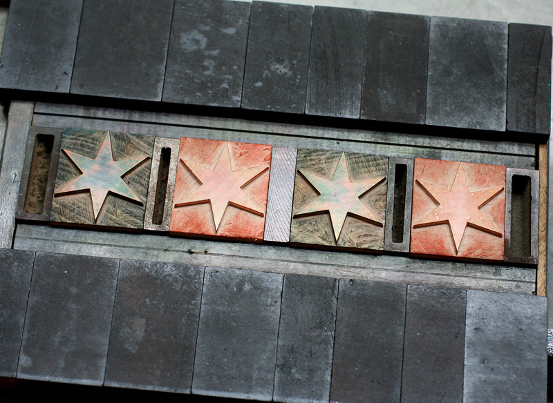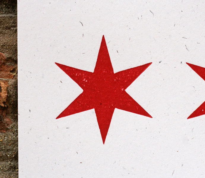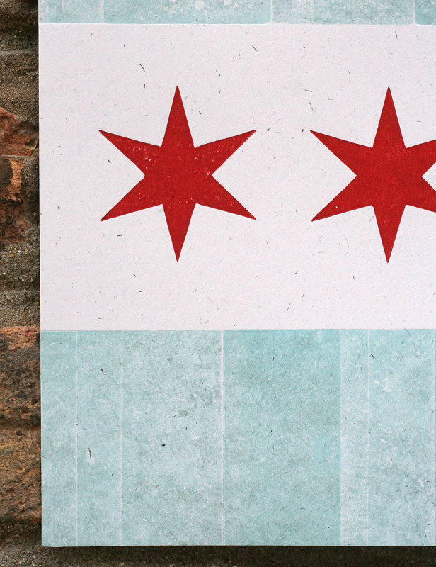 Here's our take on the Chicago flag, letterpress style! We've created the two blue bars by overprinting layers of wood type to get lots of nice texture. And the Chicago-style stars were custom made from wood just for us. Looks fabulous in a frame or just pinned on the wall. Show your love for the city of wind!
