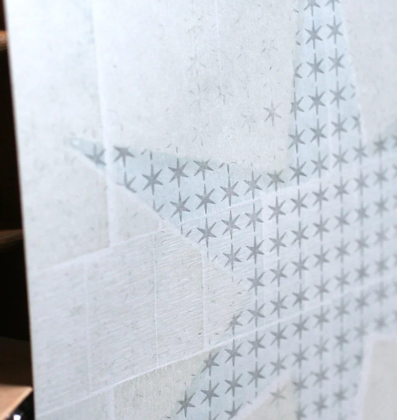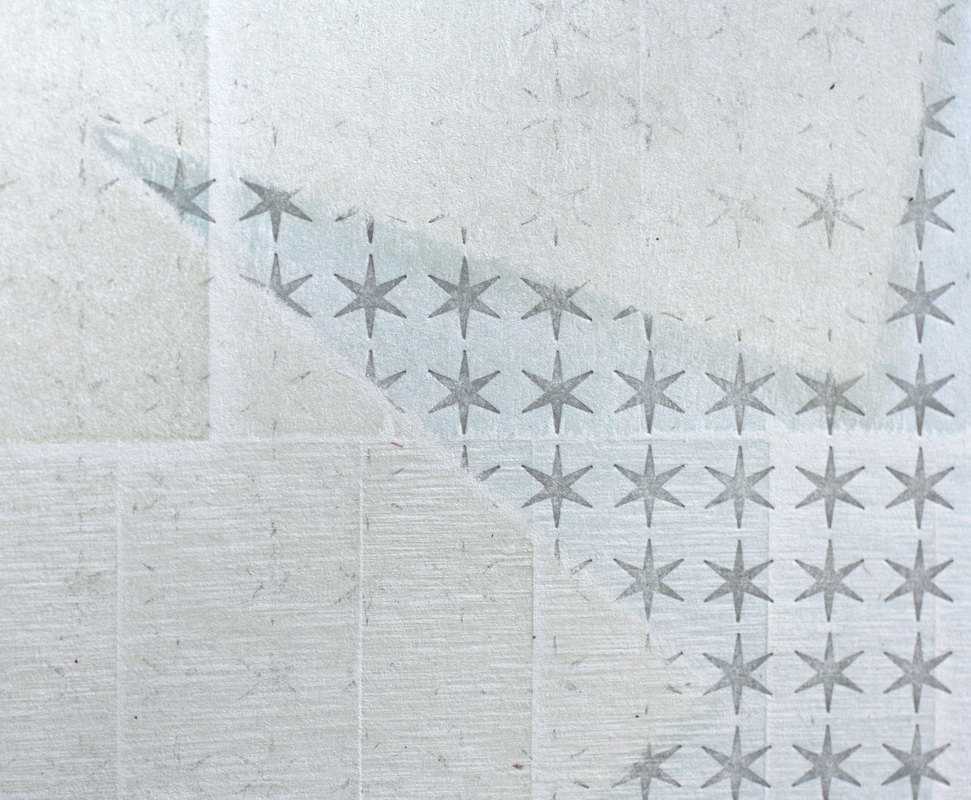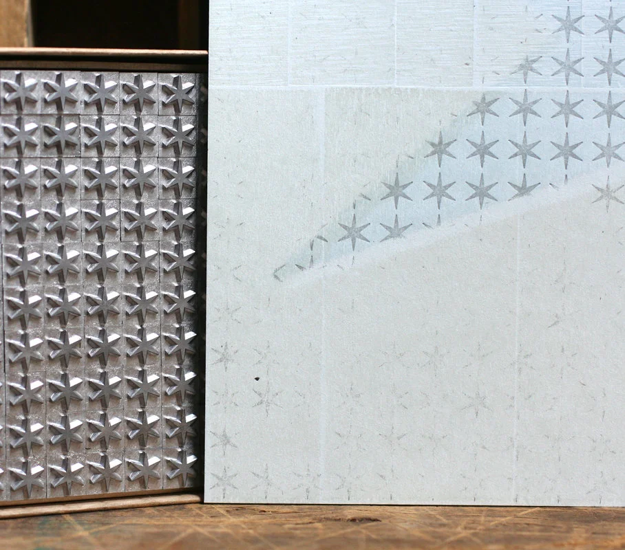 Yep, we love Chicago. So what do you do with 500 little metal Chicago stars? Make a star print! This one is letterpress printed using what's known as a pressure print to create texture and subtlety. Some stars print... some don't. There's a background wood grain texture, as well as the pale blue large star and gray tiny stars.