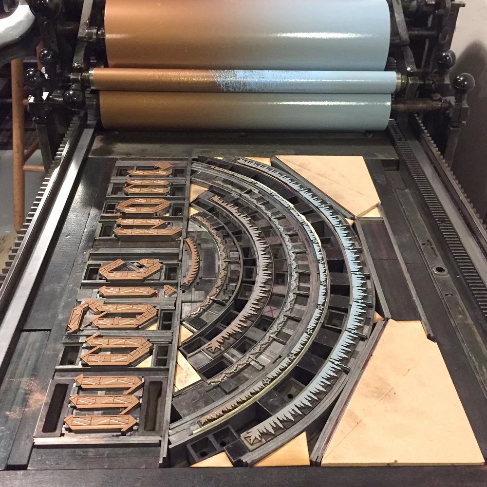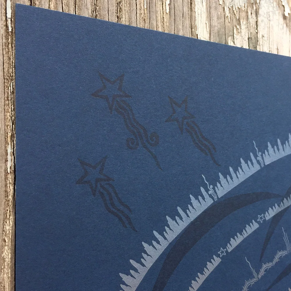 Magic Hour is the lovely time of day right before sunset and right after sunrise, when the light is soft and radiant. This letterpress print seeks to capture some of that light through the use of copper gold ink that fades to light blue, alongside a subtle darker layer that features hand carved imagery pulled from the smaller, more detailed elements.