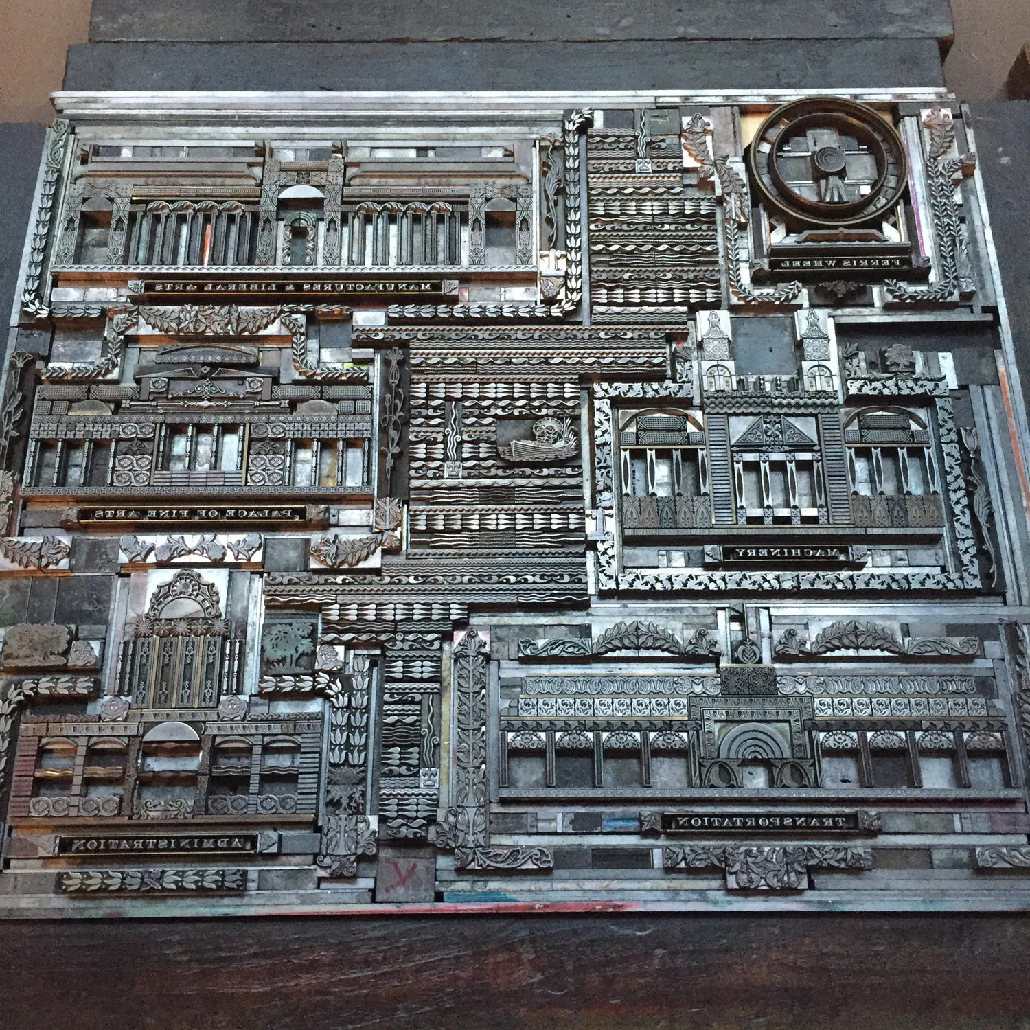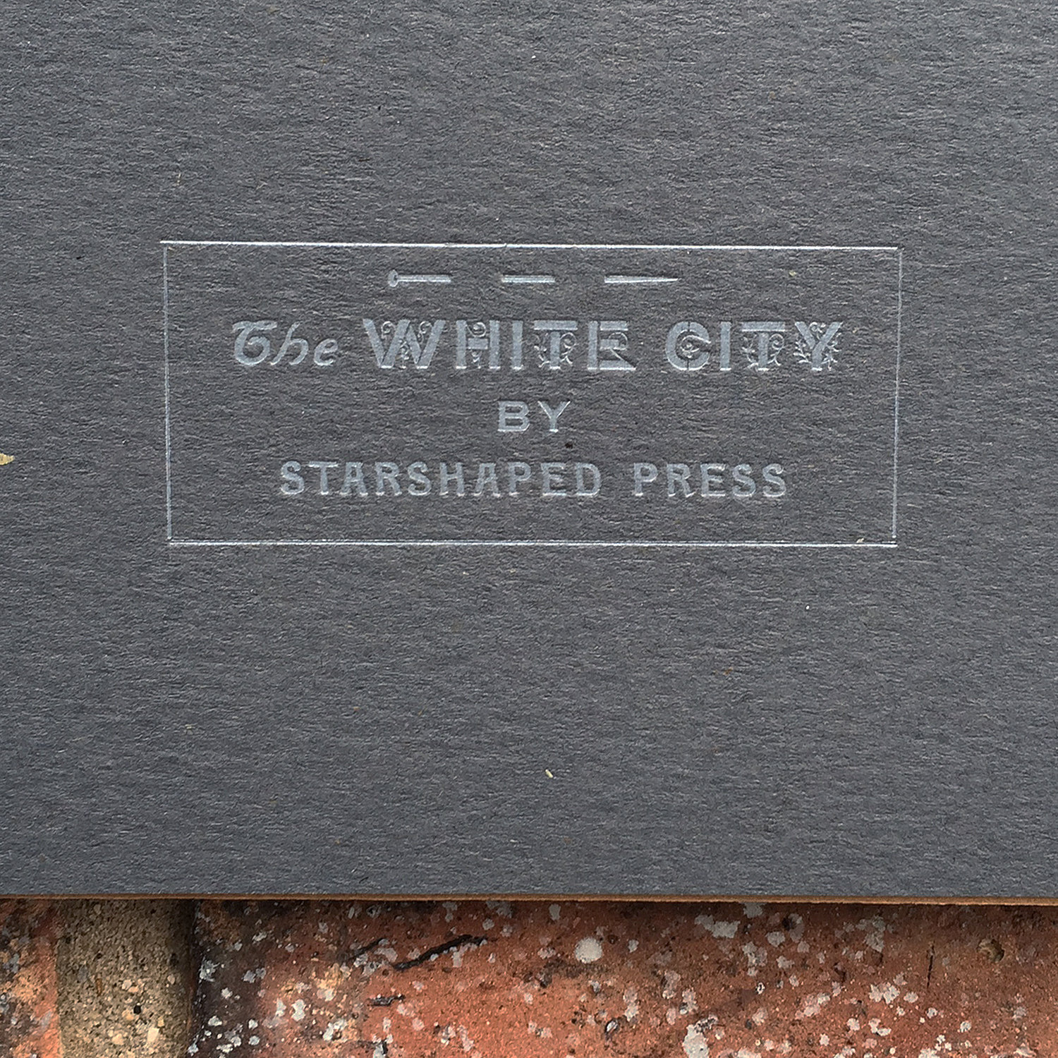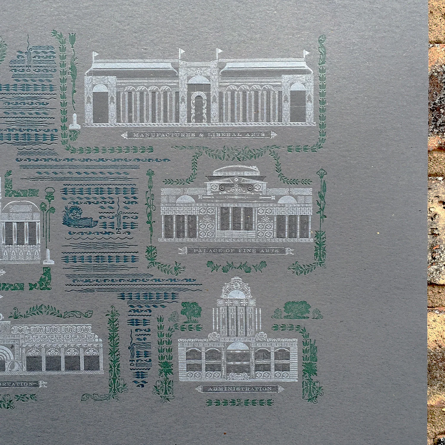 We've paid tribute to The White City in this letterpress print, built entirely from metal type, some of which dates back to the Fair itself. It is a loose interpretation of the features of each structure represented, including the grounds and lagoon between them. The buildings are printed in opaque white ink as well as a transparent varnish-like ink, while the gardens and water are in soft green and blue. The overall effect is very muted on dark gray, textured card stock. Due to the hand printed nature of each piece, as well as the recycled content of the paper, some variations will occur.
