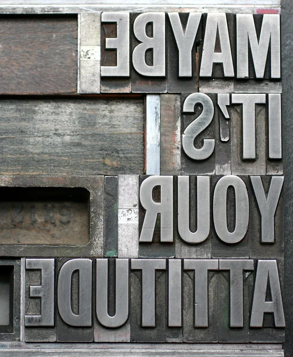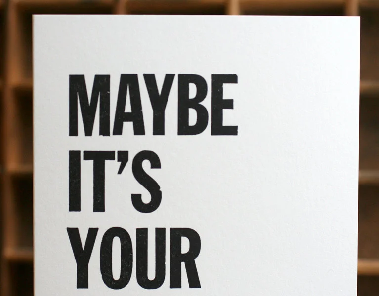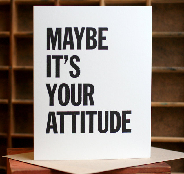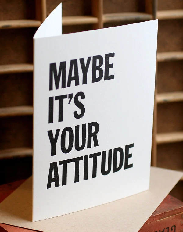 Attitude can make or break a day. This A2 card measures 4.25x5.5", and is letterpress printed with antique metal type in black ink on heavy white cardstock. Because of the hand printed nature of each piece, some variation will occur. Cards include kraft envelopes and are shipped in clear sleeves.