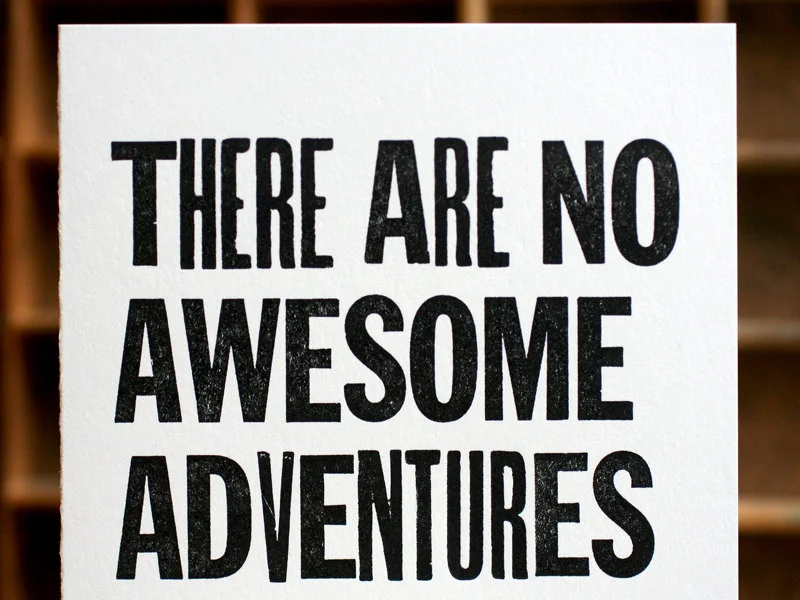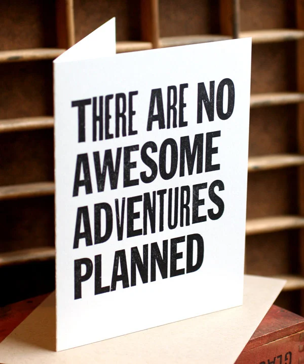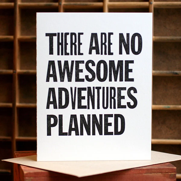 Some days, there are just no awesome adventures to be found. This A2 card measures 4.25x5.5", and is letterpress printed with antique metal type in black ink on heavy white cardstock. Because of the hand printed nature of each piece, some variation will occur. Cards include kraft envelopes and are shipped in clear sleeves.